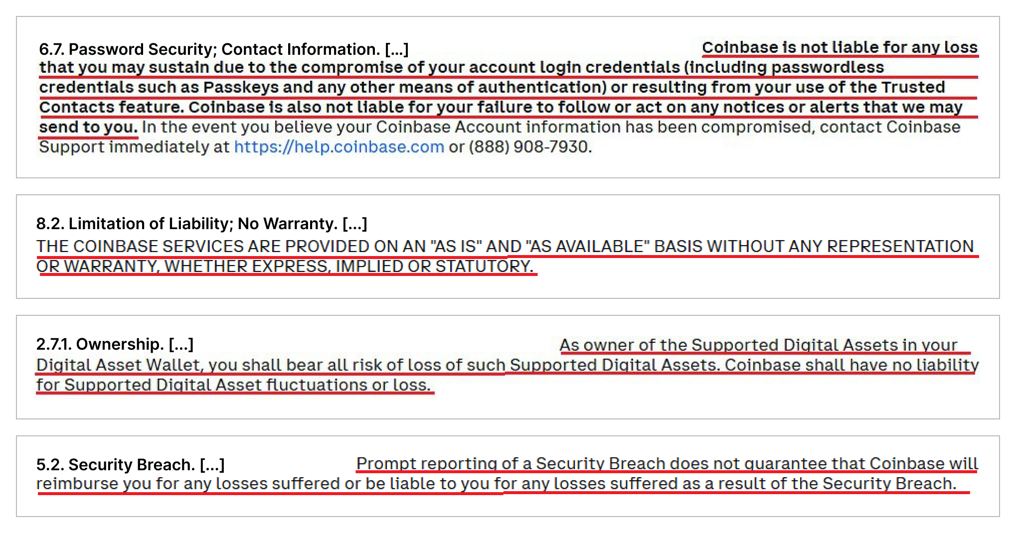 Under Coinbase’s user agreement, for example, the company is not responsible for thefts on its platform. The risk of loss falls entirely on the customer, and the company disclaims liability if your credentials are compromised and funds are stolen.